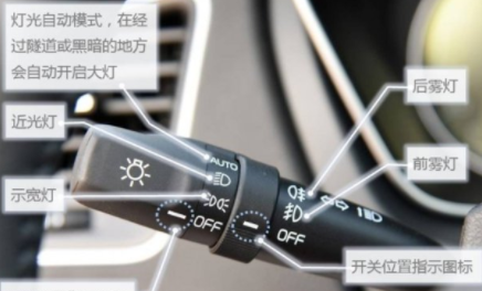 很明显,我们看到只有开关上只有“近光灯”这个挡位,转动灯光控制开关手柄,换到近光灯位置,近光灯即可点亮。旋钮式车灯开关也是如此,顺时针旋转到近光灯挡位上,近光灯即可点亮。